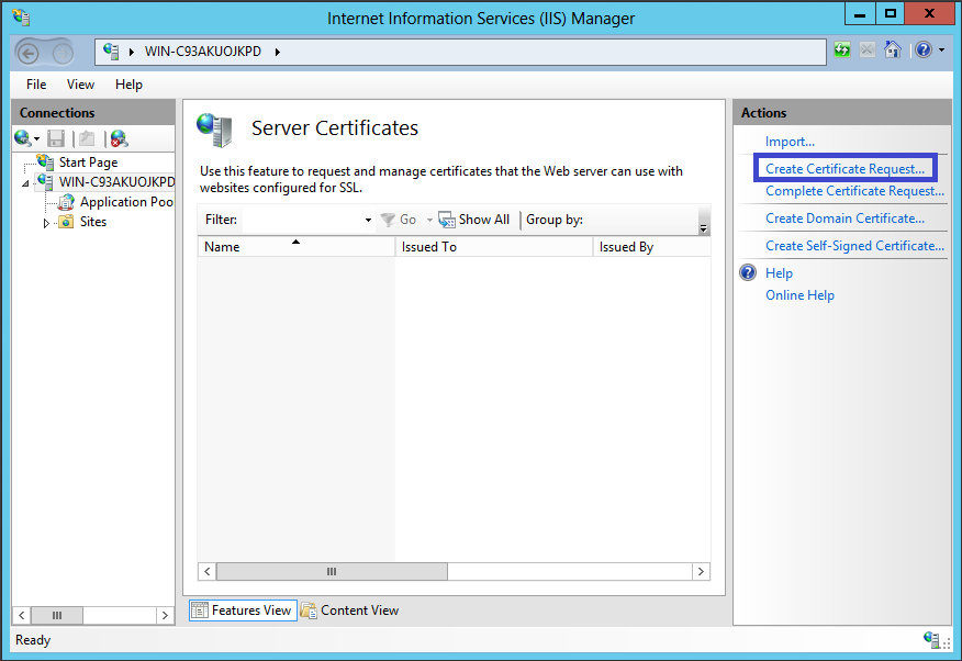 A continuación, desde el menú derecho Acciones (Actions), haga clic en Crear Solicitud de Certificado (Create Certificate Request) Esto abrirá el asistente para solicitar certificado.